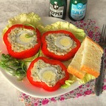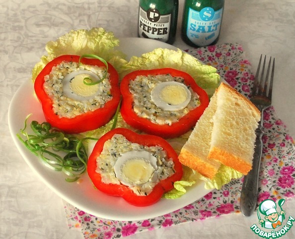 Закладываем в перец целое отварное яйцо и оставшиеся пустоты заполняем начинкой.