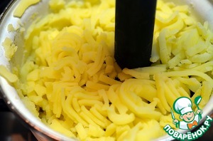 Далее потихоньку вводим ломтики сыра и активно размешиваем. Это достаточно физически сложный процесс, приходится одному человеку держать кастрюлю.