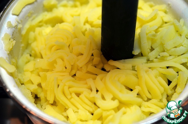 Как только картофель готов, проворачиваем в мясорубке или мнём его толкушкой.