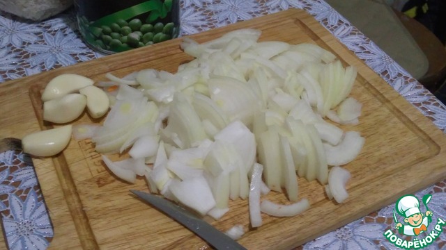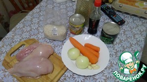 • Приготовим продукты. Промыть грудку под проточной водой, почистить морковку, лук и чеснок.