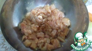 • В ёмкость с куриным филе влить соевый соус, поперчить добавить перец чили (по желанию) перемешать и оставить на 20 минут мариноваться.