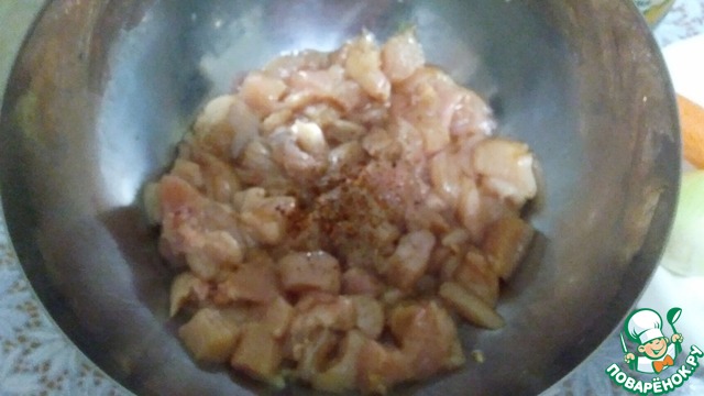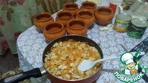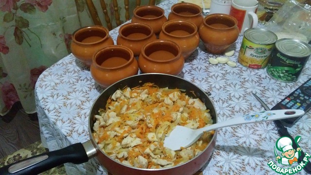 • В разогретом на сковороде растительном масле обжарить филе курицы на сильном огне до получения румяной корочки. Только после этого посолить и убавить огонь. Добавить в сковороду подготовленные лук и морковь. Перемешать. Протушить до полуготовности (когда лук станет слегка прозрачным). Разложить равномерно по горшочкам.