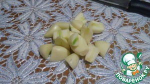 • Разложить чеснок по горшочкам, чтобы получилось по пол чесночины в горшочек (можно использовать и больше чеснока, для любителей).