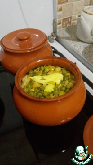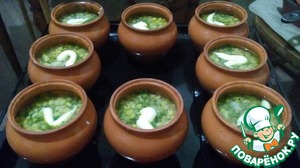 Разложить равномерно по горшочкам кукурузу и зеленый горошек. Сверху разложить равномерно промытый рис. аккуратно подровнять ложечкой, чтобы в горшочке рис лежал ровным слоем. Залить в горшочки горячий бульон (или воду) так, чтобы жидкость покрывала рис примерно на 5 мм. Сверху украсить зеленью и добавить майонез. Немного подсолить.