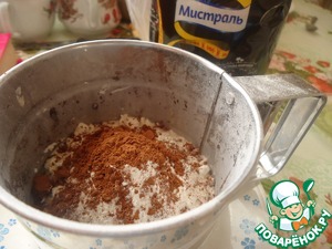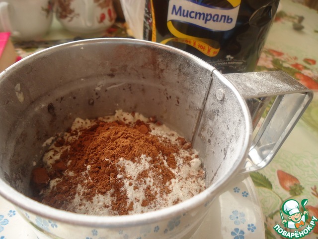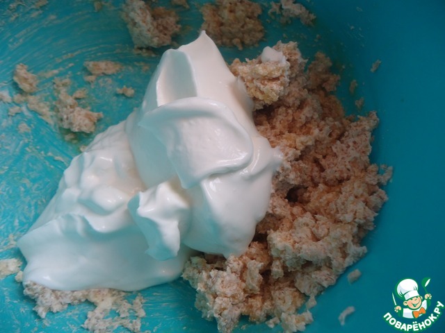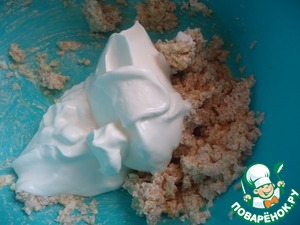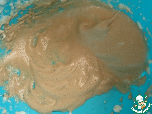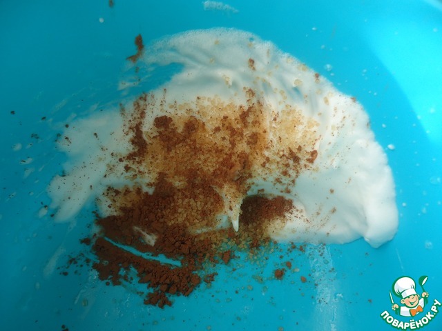 Пока запекается корж, приготовим пену. Для этого взбить охлажденные белки до пиков. Затем добавить какао и сахар.