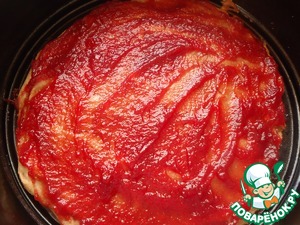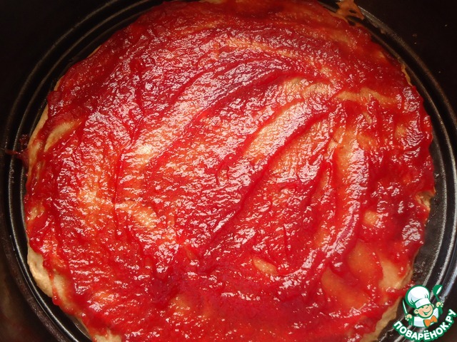 Выложить тесто в форму, у меня диаметр формы 24 см. Запекать до готовности, у меня в газовой духовке 40 мин при 180 градусов.