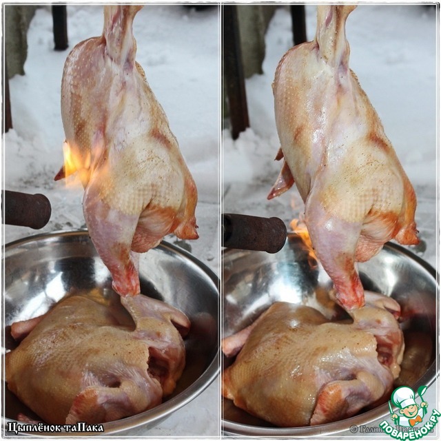 Надо только примерно минут через пять немного цыпленка шевелякать. Кожица у него нежная, прилипает.