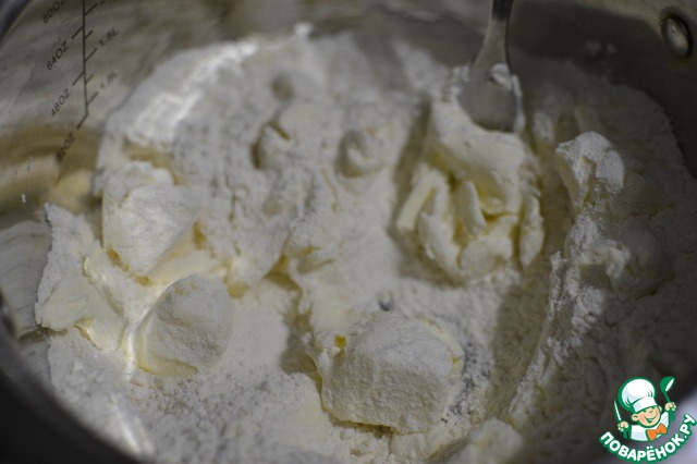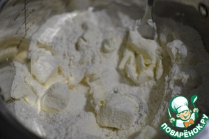 Сначало нужно заняться приготовлением теста. Муку необходимо порубить вместе с маслом. Для этого в муку нарезаем слегка подтаевшее масло небольшими кусочками.