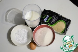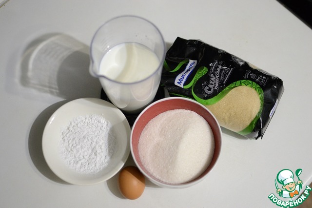 Подготавливаем продукты для крема:сахар ТМ Мистраль, молоко, яйцо, кукурузный крахмал.