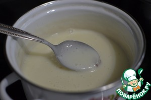 Берем молоко и выливаем в удобную небольшую кастрюльку, оставив при этом где-то 3 часть стакана, нам оно еще понадобится позже. Ставим молоко на плиту и высыпаем сахар. Пока наше молоко с сахаром нагревается мы в отдельной емкости, например, в стакане, замешиваем крахмал с оставшимся молоком. Добавляем сюда яйцо и перемешиваем. Ждем пока наше основное молоко закипит и сахар в нем полностью растворится. После того как сахар полностью растворился можно добавлять крахмальное молочко. Добавлять нужно аккуратно не спеша, постоянно помешивая. Ждем пока наш заварной крем закипит. Он должен получиться похожим на кисель. Крем можно отставить в сторону, пусть остывает, вернемся к тесту.