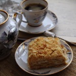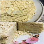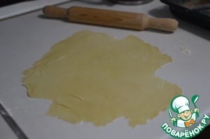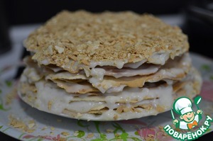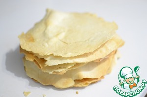 Присыпаем стол мукой и начинаем выкатывать шарики, превращая их в будущие коржи. Желательно тесто раскатывать по толщине как лист бумаги, оно должно получиться прозрачным - тонким, тонким. Ставим наш корж в разогретую до 200 градусов духовку. Выпекаем до золотистого цвета - это примерно 5 минут.