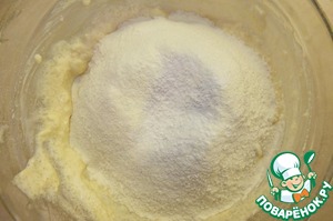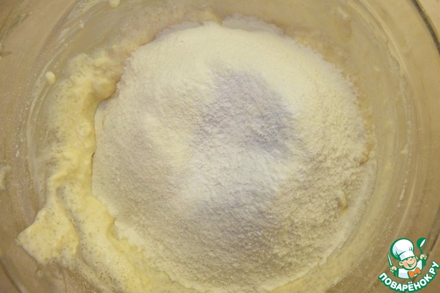 Добавляем муку и разрыхлитель. Муку вводите постепенно, ее может уйти чуть меньше или больше.