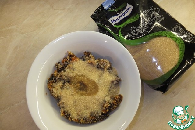 Добавляем тростниковый сахар, корицу коньяк. Перемешиваем.