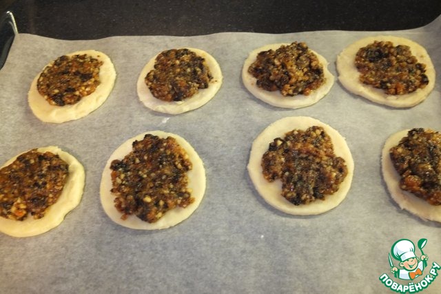 Тонко раскатываем тесто и вырезаем кружочки. У меня диаметром 7 см. Кружочков должно быть четное количество.