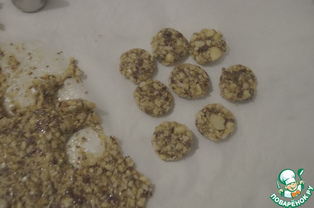 Из готового грильяжа вырезать маленькие кружочки с помощью выемки.