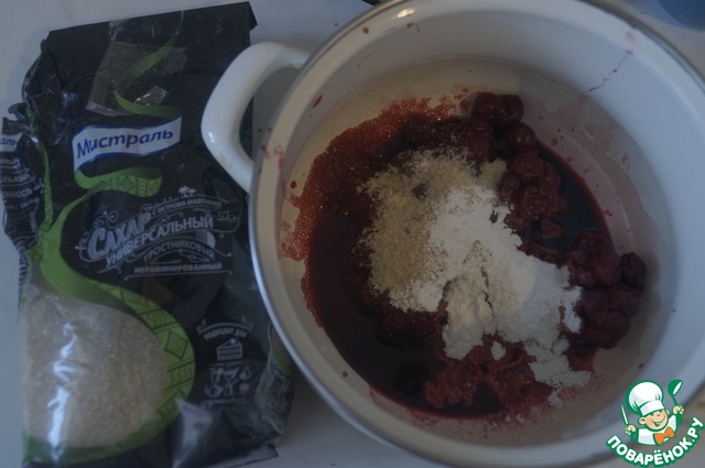 Вишню выложить в кастрюльку, добавить крахмал и сахар.