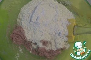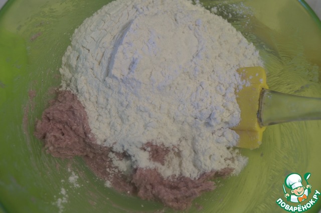 После этого добавить муку и хорошо растереть, до полного соединения масс.