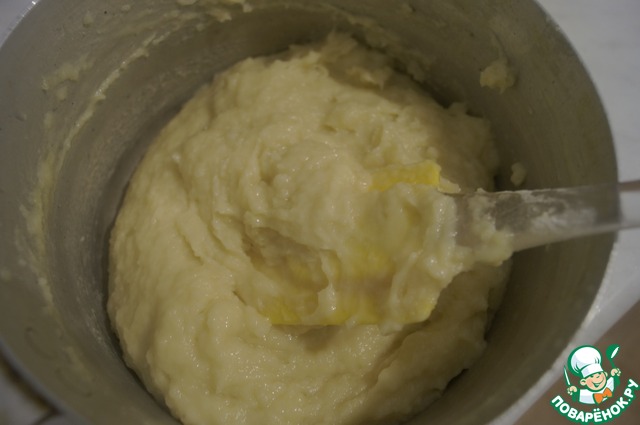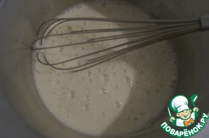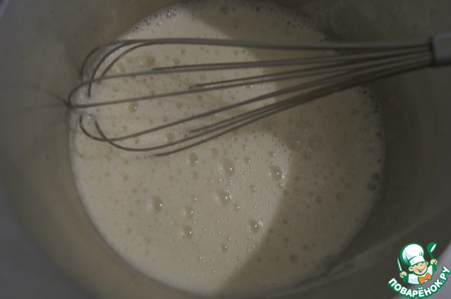 В массу тонкой струйкой влить горячее молоко, постоянно помешивая венчиком.