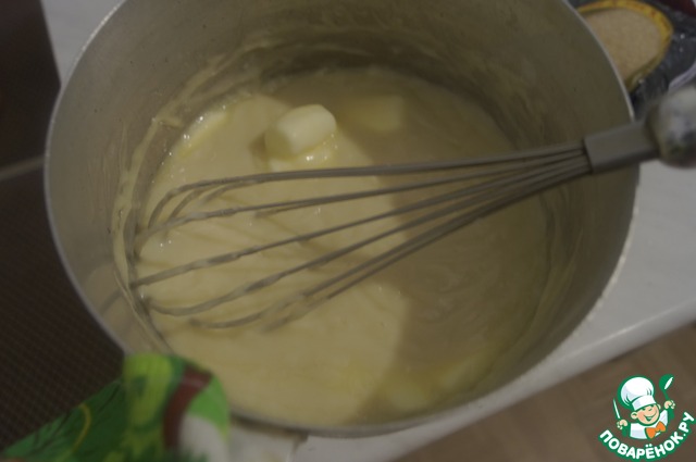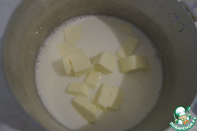 Для заварного теста: соединить в кастрюльке молоко и воду, добавить сливочное масло, соль и сахар, поставить на огонь и довести до кипения.