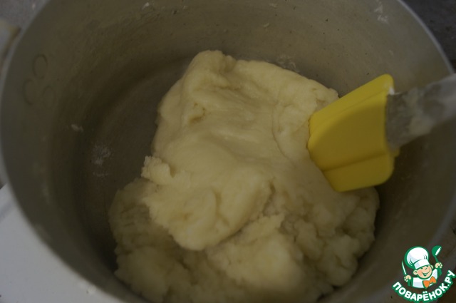 Как только тесто остынет до комнатной температуры, добавить в него яйца по одному, каждый раз хорошо перемешивая до однородной массы.