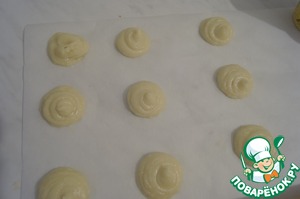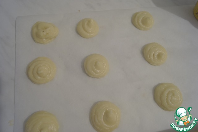 Из замороженного кракелюра выемкой вырезать кружочки диаметром как отсаженное на противень тесто.