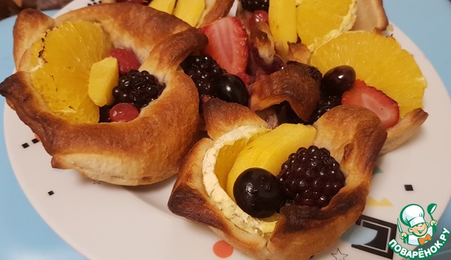 Слоеные корзиночки с нежным финиковым вареньем и фруктами.