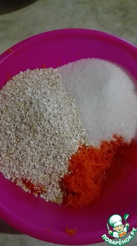 Добавляем к моркови сахар (его можно заменить на 1/3 ст. мёда-будет вкуснее), подсолнечное масло (можно оливковое) и овсяные хлопья.