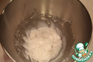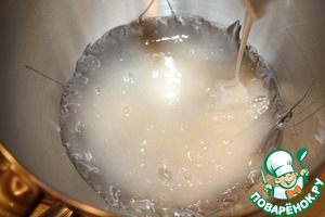 Охлажденные белки взбить, и не прекращая взбивать, тонкой струйкой влить сироп.