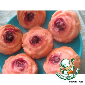 Тесто разложить по формочкам, в серединку положить вишенку, заглубить.