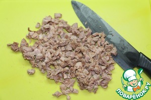 Отварное мясо порезать мелкими кубиками.