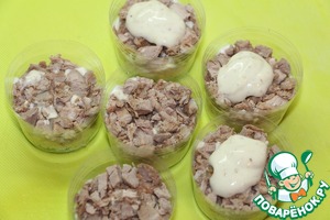 Кубики мяса и снова немного заправки.