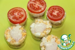 Рубленое яйцо, немного заправки, кружок помидора.
