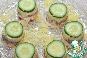 Поверх огурчика водрузить кусочек маслины.