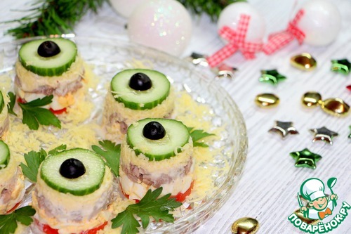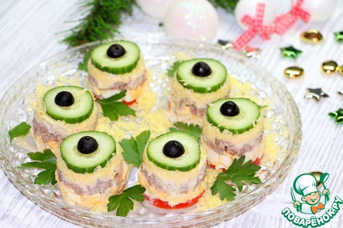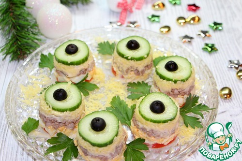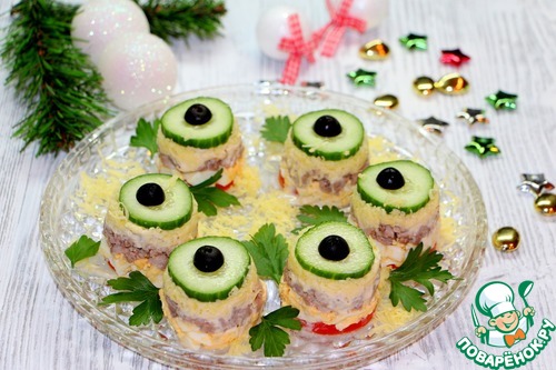 [+5]Как нарядно смотрится тарелочка со слоистыми стопочками. Очень понравился состав салата, прекрасное сочетание. Все гости оценили, а я в первую очередь. Этот рецепт теперь будет частенько гулять на наших праздниках!
