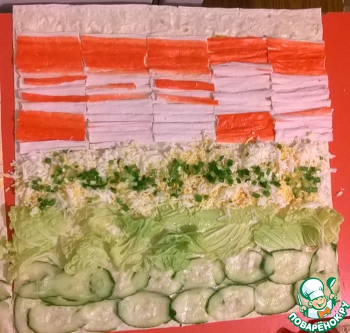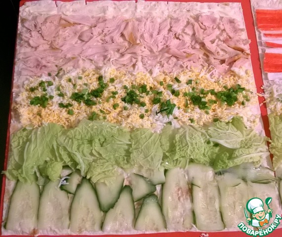 развернула крабовые палочки аккуратно, потом полоску яиц с зеленым луком, листья пекинской капусты и огурец пластинками, слегка присолила. -