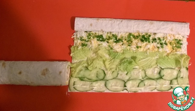 Второй лаваш я тоже промазала слегка майонезом и выложила другую начинку: