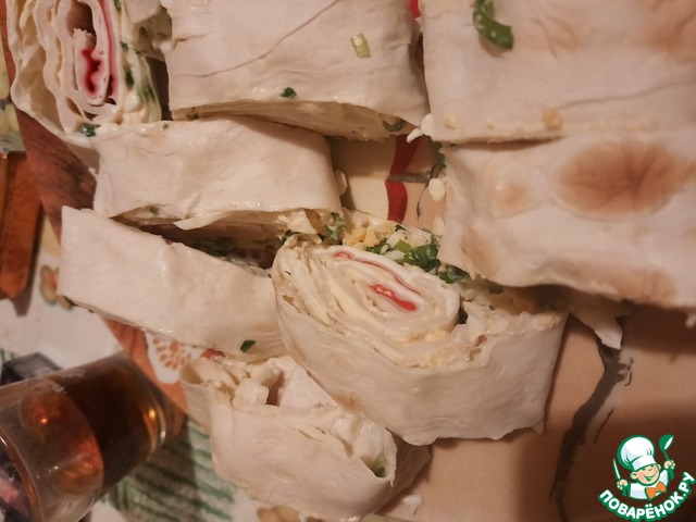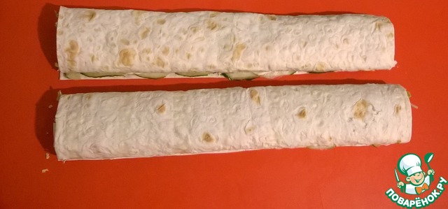 Они получаются внушительных размеров,ещё бы....там ведь три листа лаваша и еще начинка разная!)))