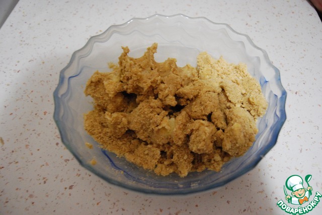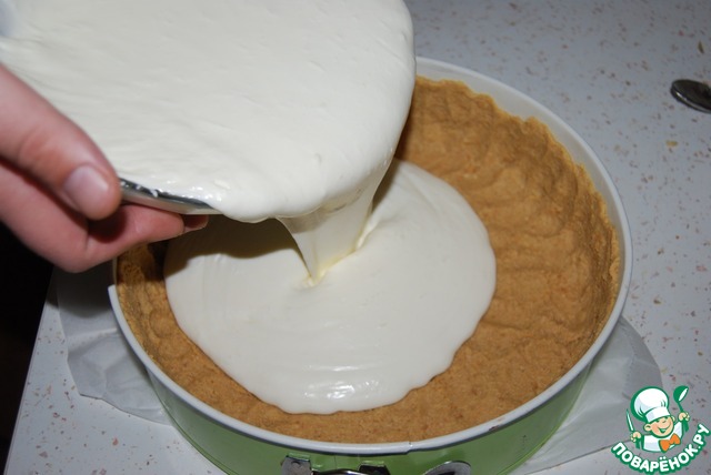 Печенье нужно измельчить в блендере или положить в чистый пакет, выпустить воздух, завязать и измельчить при помощи скалки. Добавить масло и хорошо вымесить тесто для основы торта.