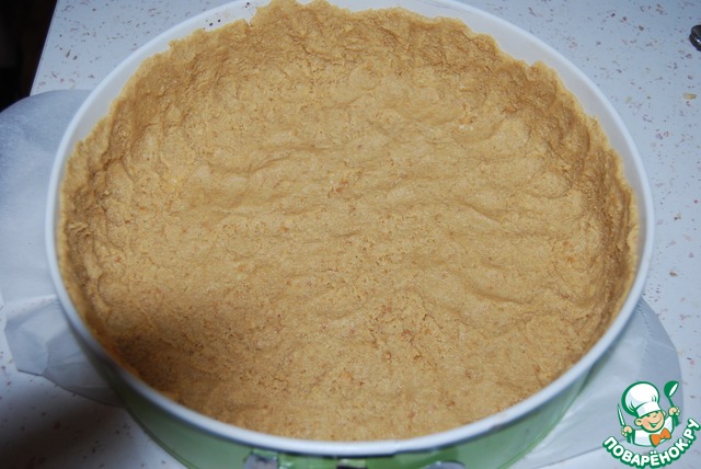 Берем разъёмную форму (у меня 26 см), застилаем пергаментом. Выкладываем массу на дно формы и по бортам. Отправляем в холодильник на 30 мин.