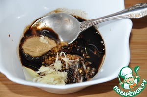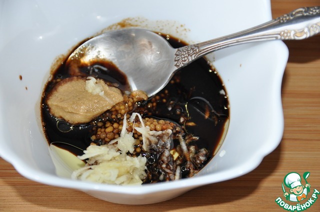 В мисочку кладём два вида горчицы (острую и с зёрнами), наливаем растительное масло, соус-маринад Teriyaki Kikkoman, натираем чеснок (или давим через чеснокодавилку). -