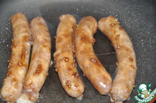 Для приготовления берём сырые колбаски, грубо по 1 шт. на персону.