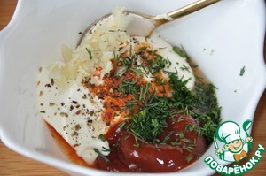 Смешиваем сметану, томатный соус (или кетчуп), табаско, выдавливаем чеснок, насыпаем свежемолотую смесь перцев, мелко рубим укроп. -