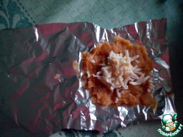 Получившийся фарш выкладываем на фольгу. А на него ложим потертый на крупную терку плавленный сыр (предварительно замороженный, чтобы легче тереть).