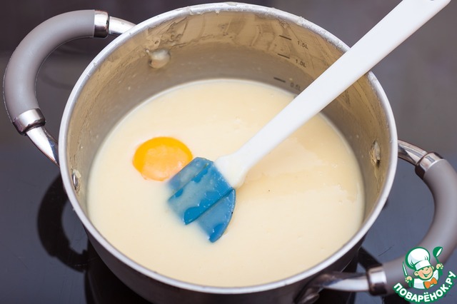 Когда смесь немного остынет, введите желтки, интенсивно размешайте. Если есть комочки, процедите и протрите их сквозь сито. -