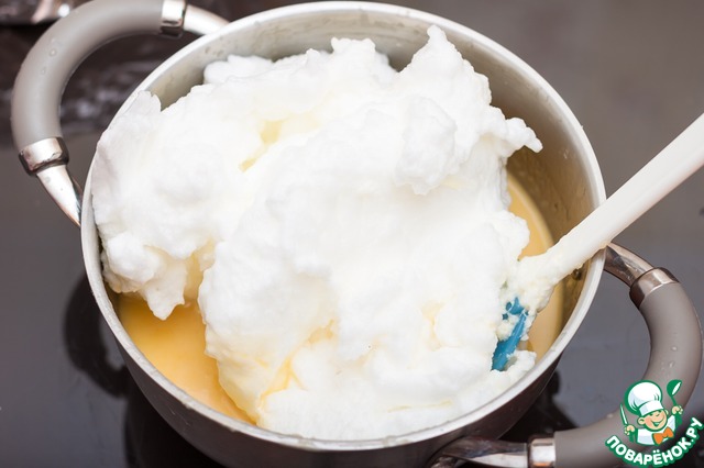 Взбейте белки с щепоткой соли в плотную пену, аккуратно вмешайте их в сырное суфле.