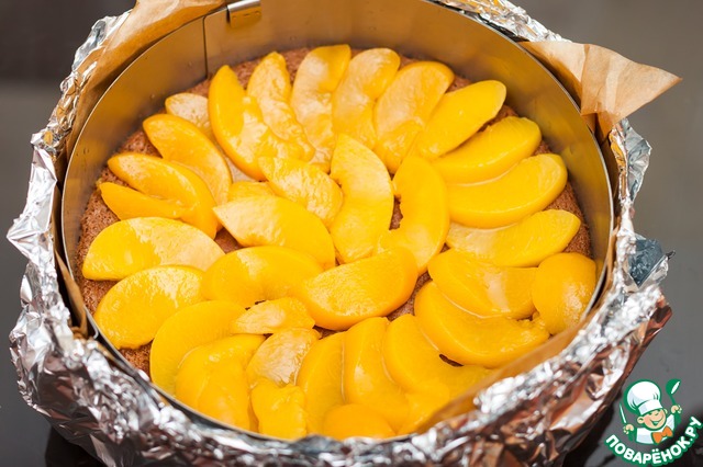 Оберните форму фольгой в два слоя, положите на бисквит ломтики консервированного персика.