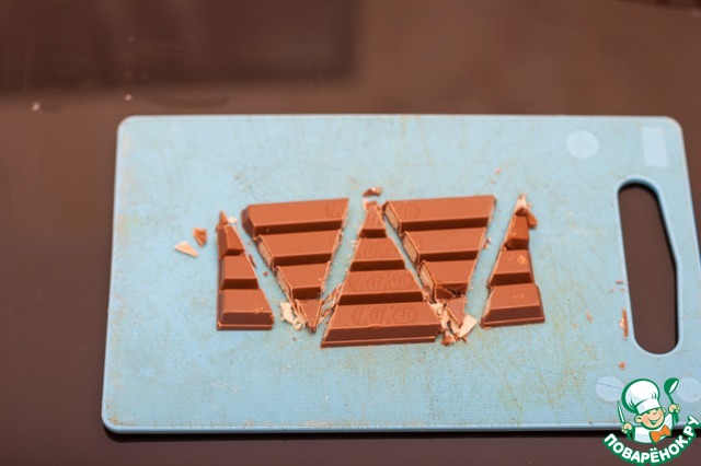 Украшаем в новогодней тематике: брикет шоколадных вафель разрезаем треугольниками - это будут елочки.