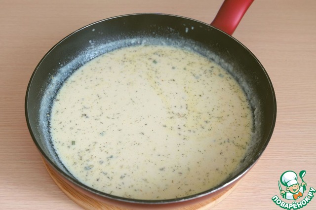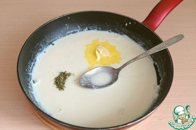 Добавить 1 стакан молока, сливочное масло (30 гр.), смесь пряных трав (укроп, петрушка, базилик, сельдерей), добавить черный молотый перец и соль по вкусу.