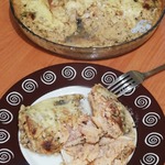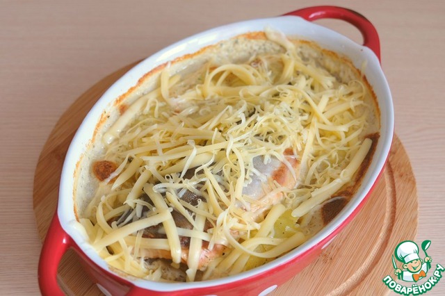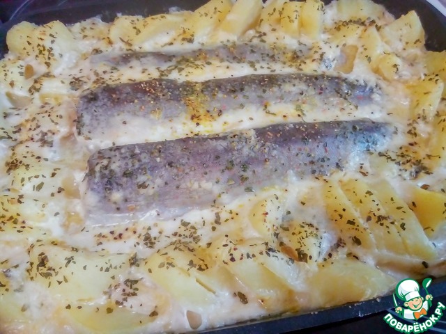 Рыбу выложить в форму для запекания, выложить подготовленный картофель, добавить в форму приготовленный белый соус. Форму отправить в духовой шкаф. Запекать примерно 30-35 мин. Хочу обратить внимание, что в некоторых духовках времени потребуется чуть больше или чуть меньше. Температура запекания 200-220С.
