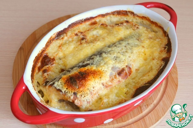 Посыпать блюдо натертым сыром ТМ "Белебеевский" и вернуть в духовой шкаф для подрумянивания блюда на гриле.